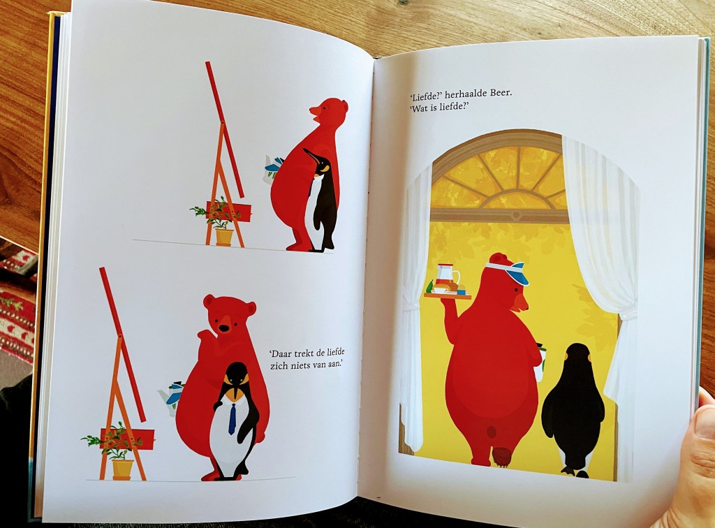 Puur gevoelsmatig gaat mijn hart echter naar een andere verliefde Beer uit. Deze Beer is dol op Vlinder die ‘zo mooi is als een uitgeknipt stukje hemel´, maar zij lijkt wel doof, stom en blind voor zijn tedere maar onhandige liefdesverklaringen. Beer is op Vlinder behoort tot het vroege werk (2004) van de Nederlandse Annemarie van Haeringen. Haar zachte, poëtische illustraties zijn rijk in al hun eenvoud. Nu ja, wat heet eenvoud … Het is een uitgepuurde eenvoud en dat vereist vakmanschap. Wie met aandacht kijkt zal ook de opmerkelijke diepte en warmte in haar aquarelwerk ervaren. Beer en Vlinder zijn bovendien veel meer dan hun penseeltoetsen; het zijn bezielde personages die leven en voelen en dartelen, dansen en stuntelen op papier. Is het ook niet heerlijk dat kinderen zich geen vragen stellen over een beer die van een vlinder houdt? Dat is de kracht van verhalen natuurlijk: alles is mogelijk.