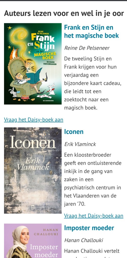 Soms gaat lezen moeilijk door dyslexie, visuele of motorische beperkingen. Een gewoon boek lezen wordt dan een ontmoedigende worsteling. Kinderen, jongeren en volwassenen met een leesbeperking kunnen gebruik maken van de online (en gratis) bibliotheek Luisterpunt. Luisterpunt biedt drie soorten boeken aan: Daisy-luisterboeken op CD of in de Anderslezen-app, groteletterboeken en boeken in braille. De collectie telt momenteel zo’n 50 000 boeken in alle mogelijke genres, gaande van poëzie tot kookboeken en anderstalige boeken. Er zijn ook 8 000 jeugdboeken, waaronder de boeken van de Leesjury. Ook fysieke bibliotheken hebben boeken van Luisterpunt in hun rekken.