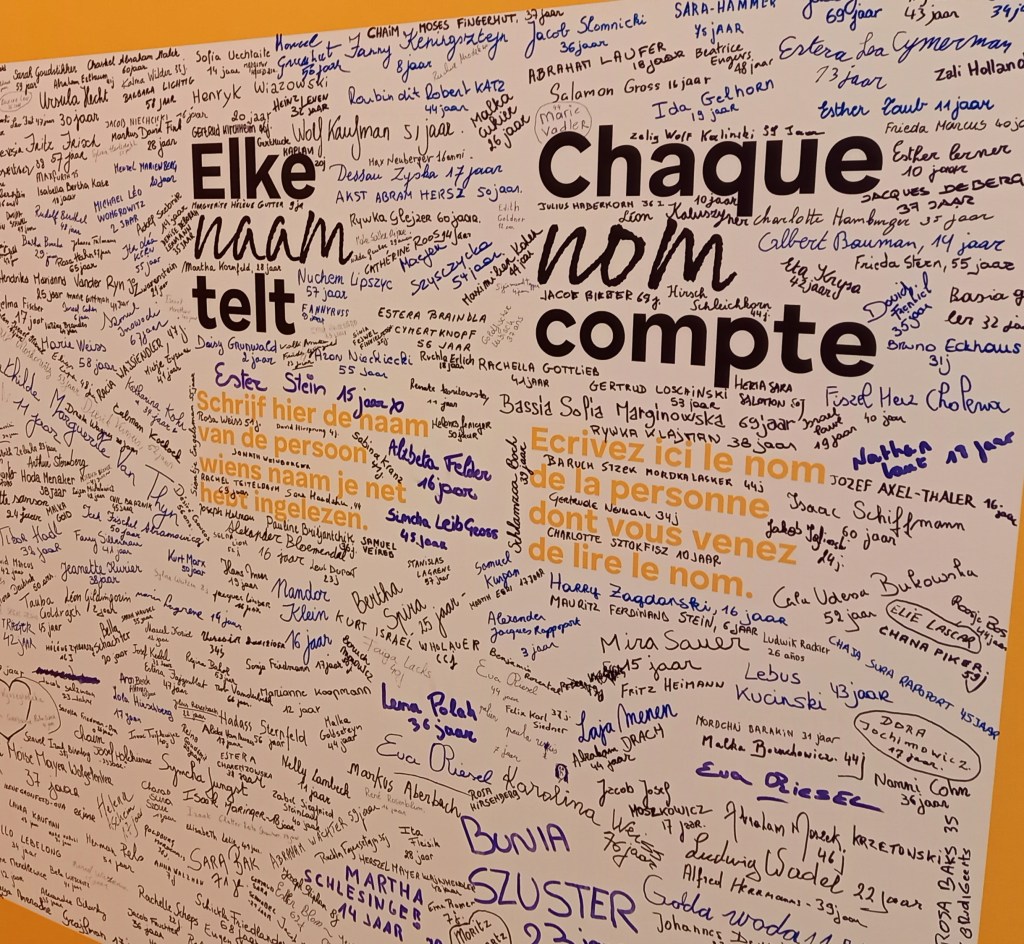 Elke naam telt In het museum Kazerne Dossin loopt sinds 4 oktober 2023 het unieke herdenkingsproject onder de veelzeggende banner Elke naam telt. Het museum zoekt 25 843 deelnemers om elk één naam van één gedeporteerde in te lezen. De toewijzing van de naam gebeurt op basis van een gemeenschappelijke voornaam, geboortedatum of leeftijd. Zo ontstaat een persoonlijke connectie tussen iemand van nu en een gedeporteerde van toen. Alle ingelezen namen zulle n weerklinken in het Memoriaal. Het Memoriaal bevindt zich in de Dossinkazerne, de plaats waar de Joden, Roma en Sinti verzameld, geregistreerd en uiteindelijk gedeporteerd werden. Dit project is dan ook veel meer dan het louter registreren van de 25 843 gedeporteerden. Het is een erkenning van hun mens-zijn, want op de plaats waar hun naam toen werd afgenomen, krijgen ze nu hun naam van ons terug.