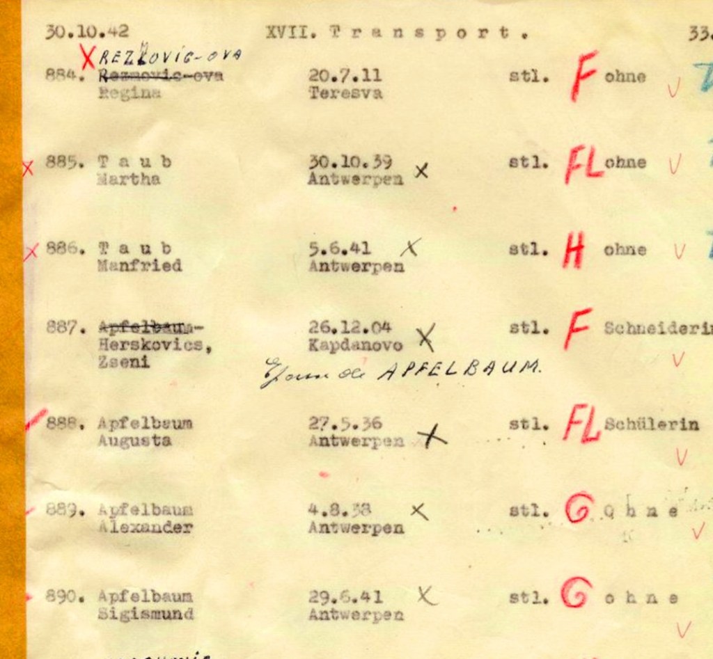 890\VXII Transportnummer 890 van transport XVII, dat is Sigismund Apfelbaum. Ik heb deze naam ingelezen voor het project Elke naam telt. We delen dezelfde geboortedatum. Sigismund werd in Antwerpen geboren op 29 juni 1941. Samen met zijn mama Zseni, zesjarige zusje Augusta en vierjarige broertje Alexander werd hij op 31 oktober 1942 met transport XVII gedeporteerd naar Auschwitz-Birkenau. Bij aankomst werd hij met zijn zus, broer en moeder onmiddellijk vergast. Hij was toen een peutertje van amper 16 maanden.